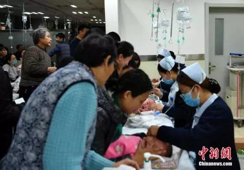 1月5日,河北省兒童醫院呼吸科大廳內,抱著孩童前來看病的父母們摩肩接踵。圖片來源:中新網