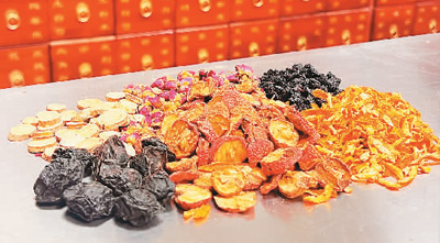 北京中醫(yī)醫(yī)院藥學(xué)部藥師根據(jù)酸梅湯配方抓取的中藥茶飲。