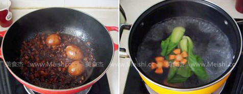 10. 燒開水,加點鹽和芝麻油,將油菜和胡蘿卜片燙熟,跟鹵肉、雞蛋一起放在米飯上拌勻食用
