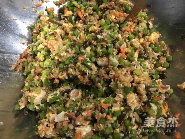 5.把蝦米加入正在腌制的雞蛋肉餡中,加一兩顆生雞蛋(餡料偏干加雞蛋調和),攪拌均勻