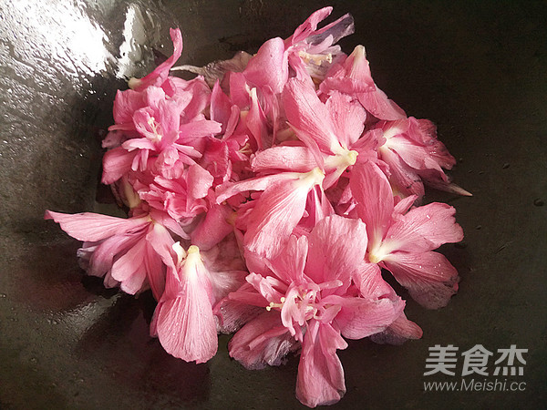 木槿花沾到熱油即刻就熟,翻炒兩下加入鹽和雞粉調味即可。