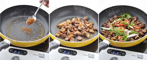 3、在文字步驟(3)中,煸炒羊肉時要大火快炒,否則羊肉很容易出湯。
