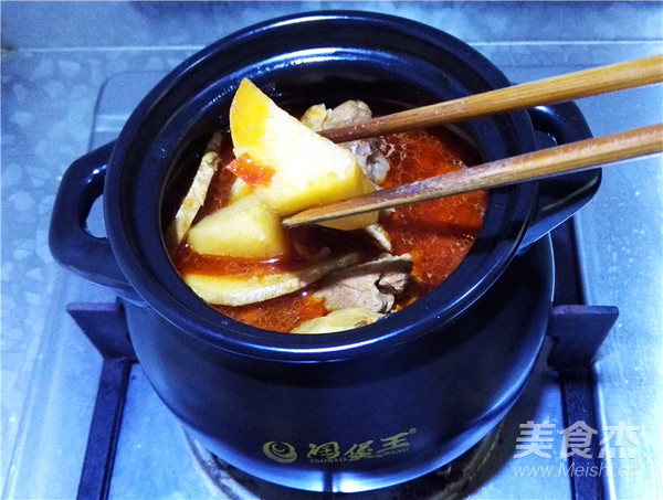 19.期間要翻動(dòng)食材,防止粘鍋,當(dāng)湯汁已經(jīng)減少一半,鴨腿肉成熟、土豆軟爛即可關(guān)火。