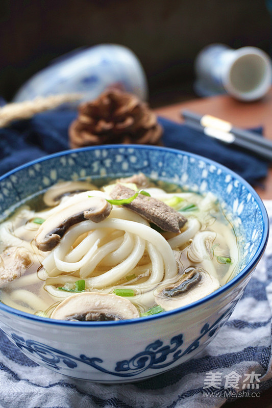 把煮好的烏冬面撈放碗里,然后把豬肝湯勺入即可