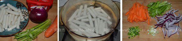 3.煮年糕的時候,可以一邊準備配料,將胡蘿卜、洋蔥切絲、芹菜切段,蔥切花