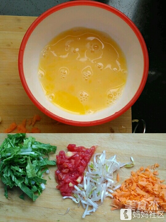 如圖,把雞蛋打散,把食材切成寶寶能吞咽的大小,小的寶寶建議切的碎碎的,我家源兒牙口好,這么大沒問題。