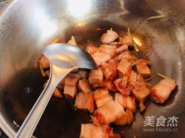 下入腌制好的五花肉,小火煸炒煸至吐油略微變黃為宜