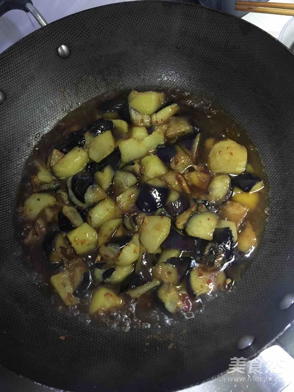 放豆瓣醬炒出紅油,然后放入土豆和茄子,翻炒均勻