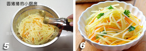 5.將過涼后的土豆絲,胡蘿卜絲撈起瀝干水份,放入大盆內(nèi)加入香菜碎、鹽、雞精、芝麻香油、花椒油