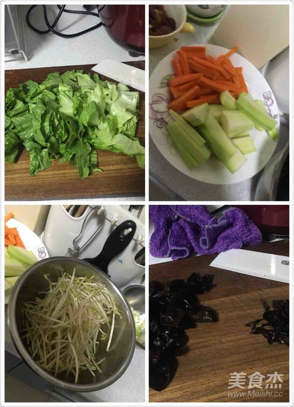 生菜切絲,西葫蘆和胡蘿卜切條狀,豆芽控干水,木耳切絲。