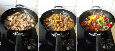 13.燉至雞肉和板栗熟透,大火收汁,加入彩椒翻炒均勻即可出鍋。