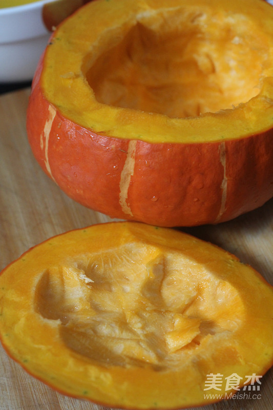 注:吃的時候可以把南瓜肉刮下來和烏米飯、玉米、青豆、松仁、蝦仁、草莓等拌在一起,非常的好吃。