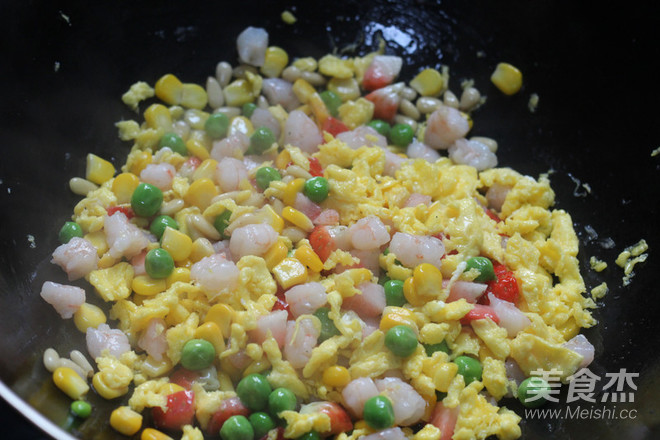 7.起油鍋,入玉米、青豆和松仁翻炒