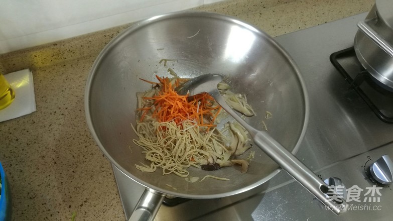 胡蘿卜、豆腐皮切絲(越細(xì)越好),香菇切薄片,金針菇把頭去掉,平菇用手撕細(xì)條后備用