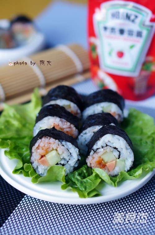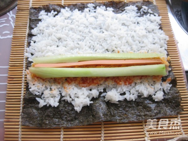 2、米飯平鋪在紫菜上面,注意首尾留一點空,不要鋪太滿了,不然卷的時候會擠出來。