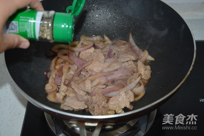 把肉片劃散到一邊,倒進洋蔥絲翻炒