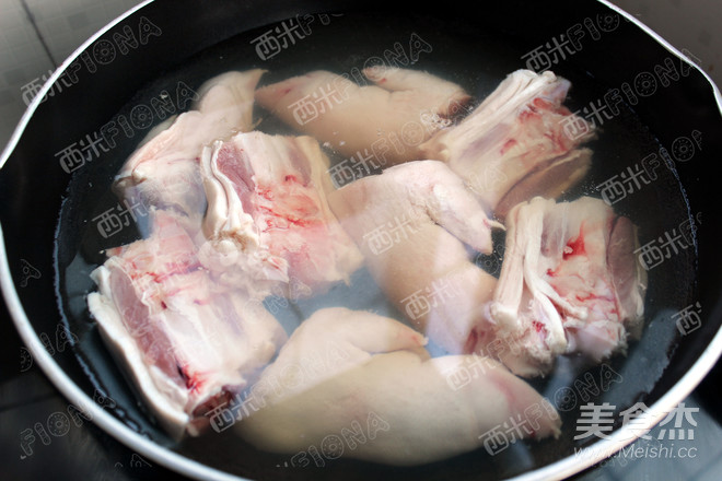 2.豬蹄選前蹄,剁塊洗凈,冷水下鍋焯燙至發(fā)白。撈出洗凈浮沫
