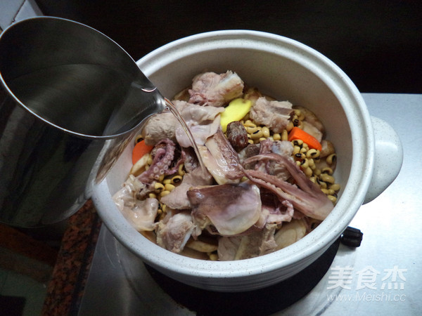 加入紅蘿卜塊、眉豆、焯過水的豬骨頭