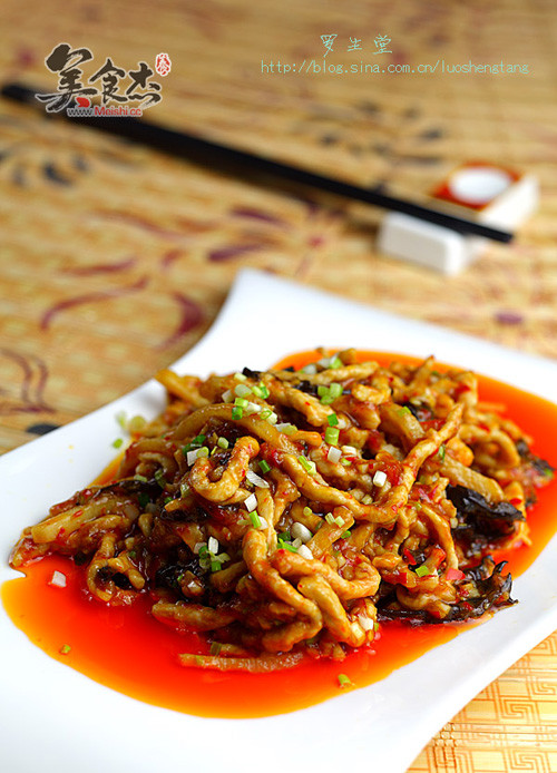 8.重中之重,味汁(料酒10克、米醋20克、白糖25克、鹽一點點、醬油15克、淀粉15克),記住汁量不可大,不然炒出來湯汁太多,油稍多些,五成熱時下泡椒和漿好的肉絲炒開,如果不好炒用筷子劃拉,炒開立刻放蔥姜蒜炒香,然后放入焯過的冬筍絲和木耳絲,最后倒入味汁,再炒幾下就可以了