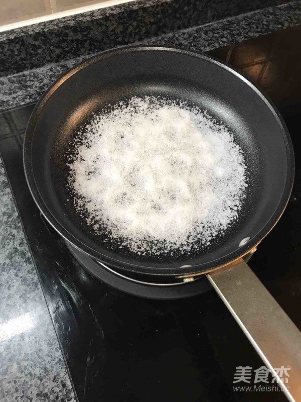 平底擦干后,倒入海鹽鋪滿鍋底。開中火預(yù)熱6~7分鐘